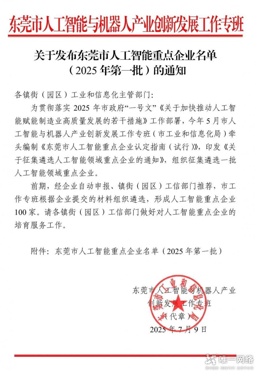 近日,東莞市人工智能與機器人產業(yè)創(chuàng)新發(fā)展工作專班正式發(fā)布《東莞市人工智能重點企業(yè)名單(2025 年第一批)》,唯一網絡憑借在人工智能領域的戰(zhàn)略布局、技術積淀與產
